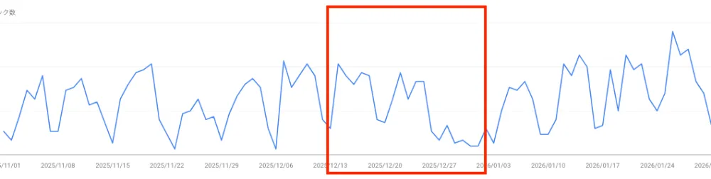 この時期のデータを見るときは、主要ページの掲載順位だけでなく、クリック率や表示回数の変化にも目を向けたいところです。順位が大きく変わっていなくても、検索結果での見え方や需要の変化によって流入が動くことがあるためです。単一の指標だけで判断しないことがポイントになります。