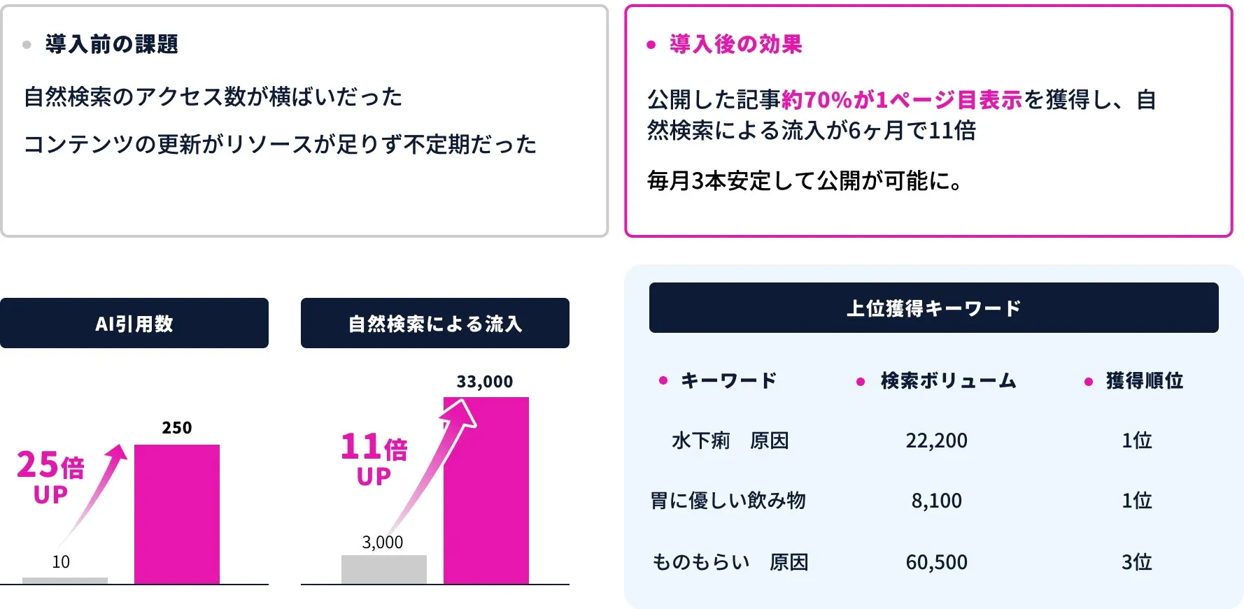 ここでは、株式会社ProteaのAIフォースSEOを導入した企業の事例を紹介します。