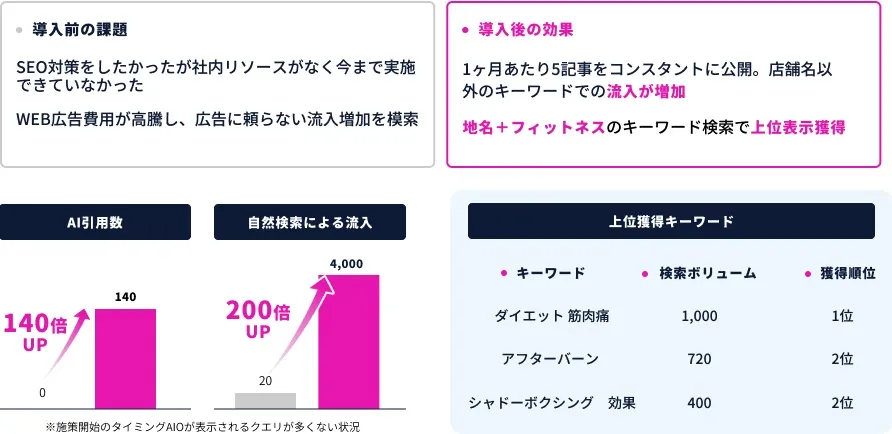 「ダイエット 筋肉痛」で検索ボリューム1,000の1位、「アフターバーン」で2位など、店舗名以外のキーワードでの上位表示も実現しました。