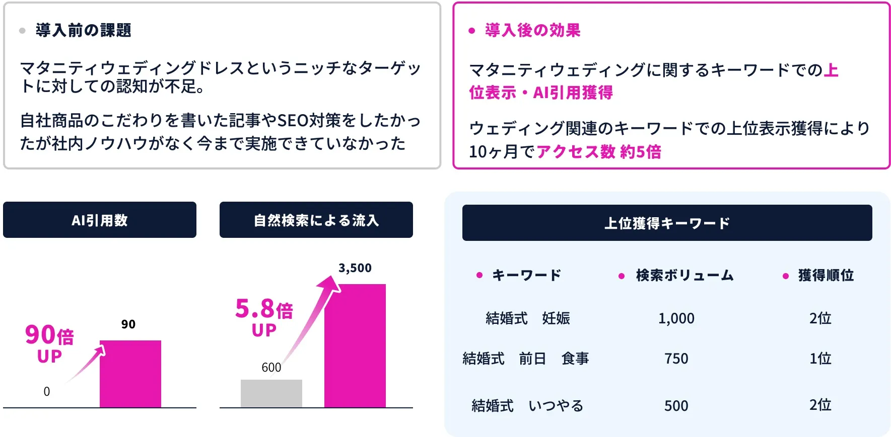 社内にSEOノウハウがない状態からスタートし、関連キーワードでの上位表示を獲得。自然検索による流入は5.8倍に伸長し、「結婚式 前日 食事」では検索ボリューム750で1位を達成しました。